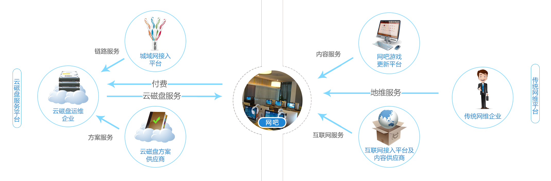 用户接入云磁盘系统,通过服务器虚拟化技术,将网吧服务器全面集中,统一调配,提高设备利用率,降低设备投资 ,通过网吧城域网云服务平台建设,将分布式的网吧维护管理全面集中,在中央机房中进行分层管理,降低网吧运维费用,提高网吧的运营效率。用户仅需向云平台服务运营者按需缴纳相应费用即可拥有超高性能无盘服务+游戏更新服务+外网接入服务+专业的维护服务。